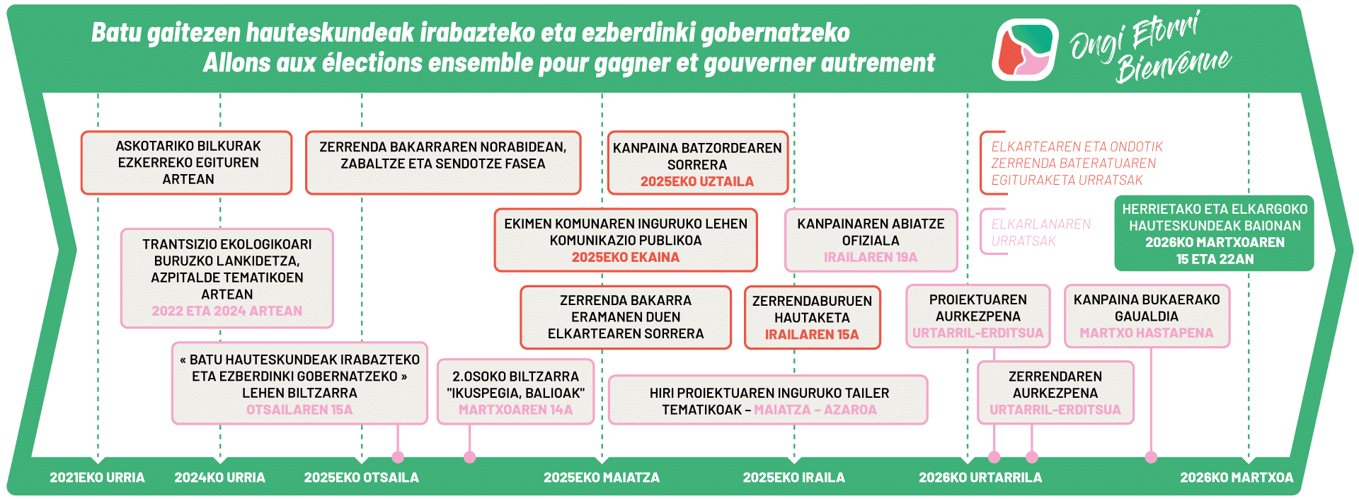 2022tik elkarteek eta erakunde politikoek abiaturik, gure mugimendua pixkanaka sendotu eta zabaldu egin da, eta 2025eko uztailean zerrenda herritar eta parte-hartzailea eramaten duen elkarte bat sortu zen, ezkerreko sentsibilitateak beren aniztasunean batzen dituena eta erabat irekia dena.