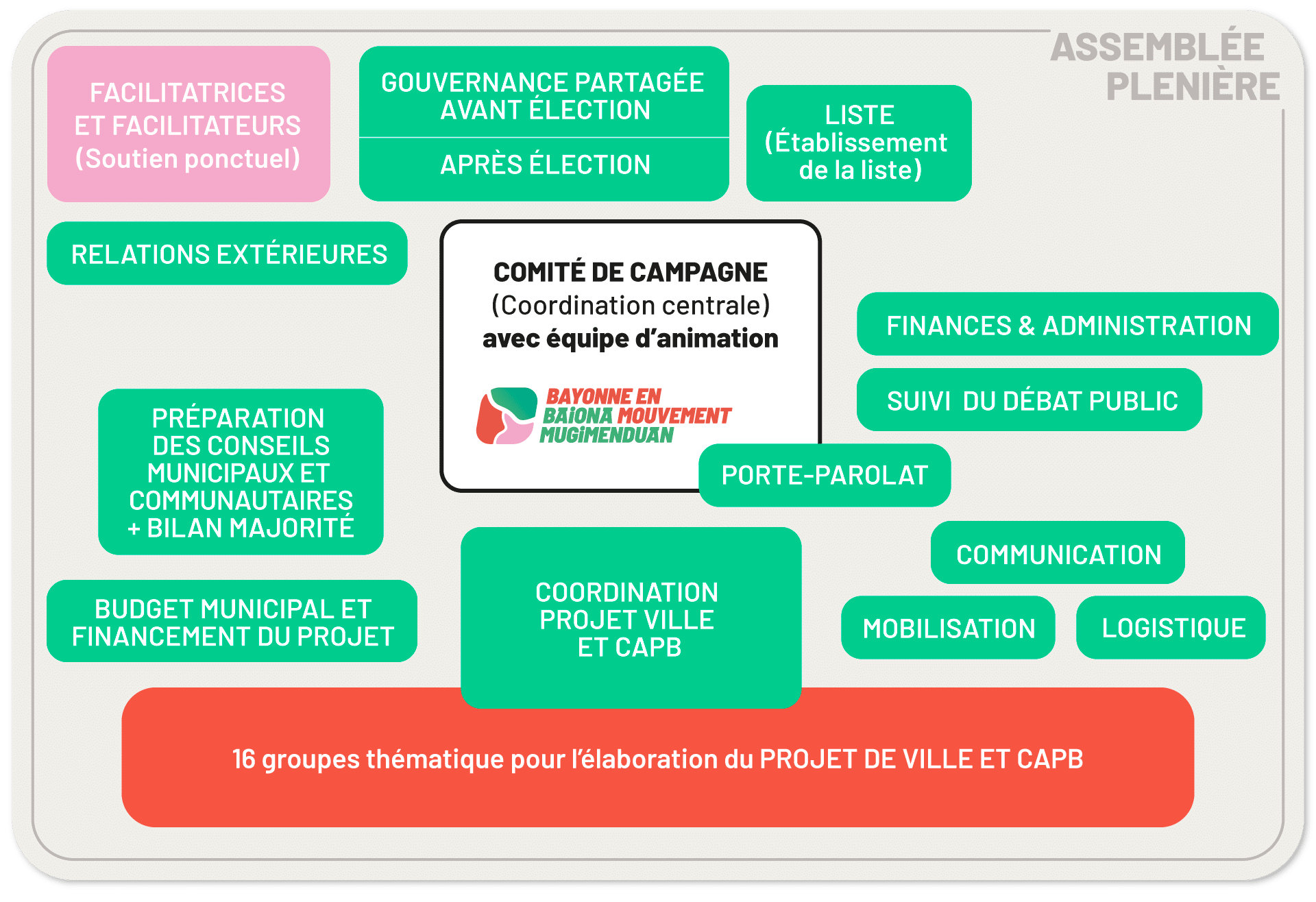 Nous pensons enfin un Bayonne pleinement ancré dans un Pays basque équilibré, capable de répondre de manière territorialisée aux défis du logement, de l’économie ou du social, et qui s’engage pour une évolution institutionnelle d’une CAPB plus démocratique, plus efficace et plus proche de ses habitant.e.s